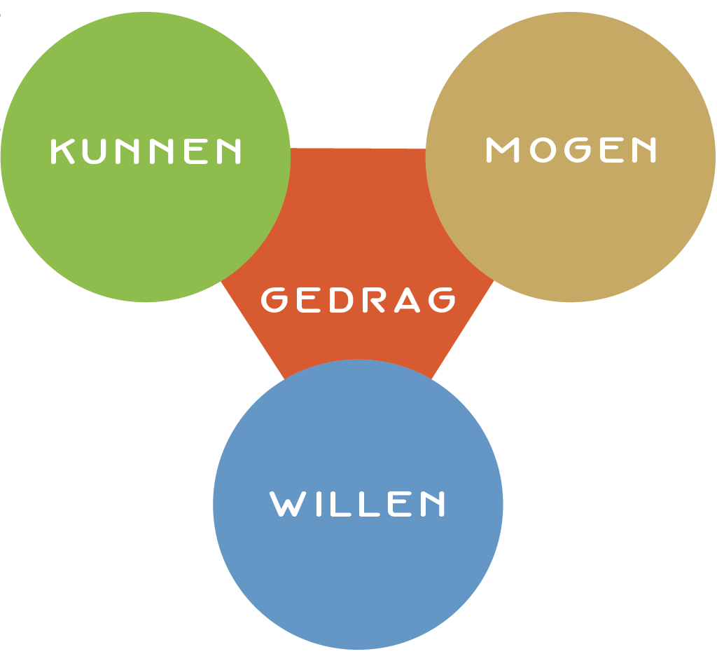 Een van de modellen die bruikbaar zijn om gedrag concreet te benaderen, is het Triademodel (zie figuur 1) van hoogleraar Theo Poiesz, deskundige op het gebied van gedragsverandering.1 Hij laat zien dat een bepaald gedrag wordt vertoond als er voldoende motivatie, capaciteiten en gelegenheid voor zijn. Oftewel: wil iemand het, kan iemand het en krijgt hij er de kans voor? Voor we de kans op gedrag kunnen inschatten, is er nog een andere vraag aan de orde: over welk gedrag hebben we het precies? Vaak denken we te snel dat dat wel duidelijk is. ‘Meer groente eten’ wellicht, of ‘stress verminderen’? Hierbij is nog geen handeling geformuleerd. De kans is daardoor groot dat degene die zijn gedrag wil veranderen, niet weet wat hij precies moet doen. Of dat de professional die hem begeleidt, een ander beeld heeft dan de persoon zelf.
