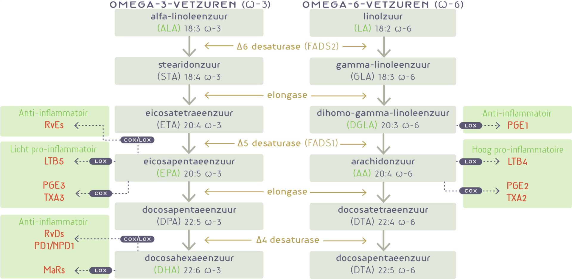 De vele regulerende functies van omega-6- en omega-3-vetzuren komen grotendeels tot stand via hun metabolieten (oxylipinen). Oxylipinen worden enzymatisch gevormd door cyclo-oxygenases, lipoxygenases, CYP450-enzymen, of door niet-enzymatische auto-oxidatie.17 De best bekende oxylipinen zijn de eicosanoïden (prostaglandinen, tromboxanen, leukotriënen en lipoxinen) van arachidonzuur. Ook de eicosanoïden van EPA en docosanoïden van DHA zijn uitgebreid in kaart gebracht.