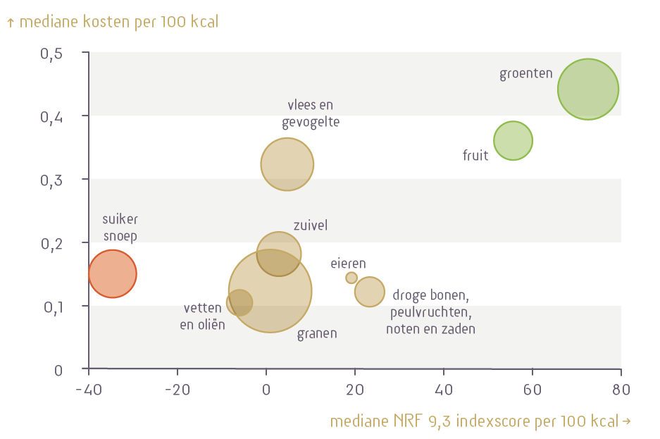 Gerekend per kilocalorie is van alle voedingsmiddelen de micronutriëntendichtheid (en ook de prijs) van groente en fruit het hoogst (figuur 1). Hun energie-inhoud (kcal/gram nat gewicht) is echter laag en er moet dus veel van worden gegeten om aan voldoende macronutriënten te komen.52-54a Zo is voor de inname van een derde van de dagelijks aanbevolen hoeveelheid ijzer voor volwassenen boven de 25 jaar benodigd: 37 g lever, 43 g gedroogde kleine vissen en 89 g schelpdieren, tegen 290 g donkere groene bladgroente, 377 g volle granen en meer dan 4 L koemelk.46,47,55,56 De beschikbaarheid van ijzer uit dierlijk materiaal is bovendien ook beter dan uit plantaardig materiaal. Sommige micronutriënten zijn nooit in voldoende mate uit groente en fruit te halen, zoals vitamine B12 en het dierlijke D3. Voor andere nutriënten is dat sterk afhankelijk van de gehaltes in de bodem, zoals voor jodium en selenium.57,58 Naast de limiterende essentiële aminozuren lysine, threonine, methionine en tryptofaan zijn de kritische nutriënten voor veganisten en vegetariërs: de visolievetzuren EPA en DHA1, vitamine B2, calcium, zink, selenium en jodium.1,59,60 In tabel 2 worden de kritische micronutriënten voor vegetariërs, veganisten en vleeseters weergegeven.61,110