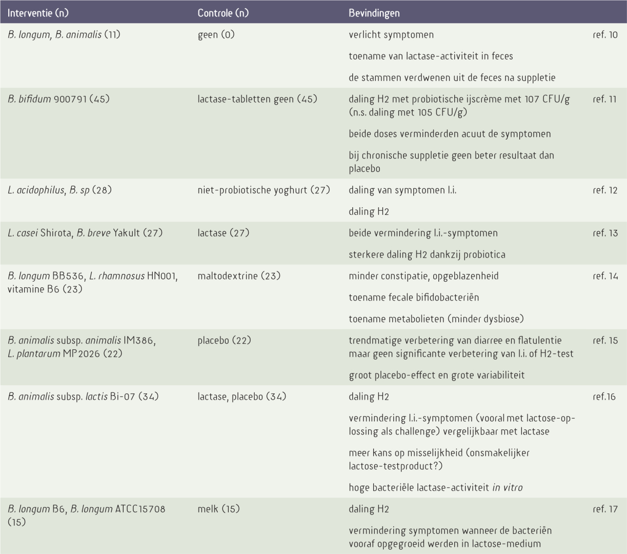 Afkortingen: B. bifidobacterium, L. lactobacillus, H2 waterstof in de ademtest, l.i. lactose-intolerantie, n aantal deelnemers, CFU kolonie-vormende eenheden, n.s. niet-significant. Lactase is synoniem voor β-galactosidase.