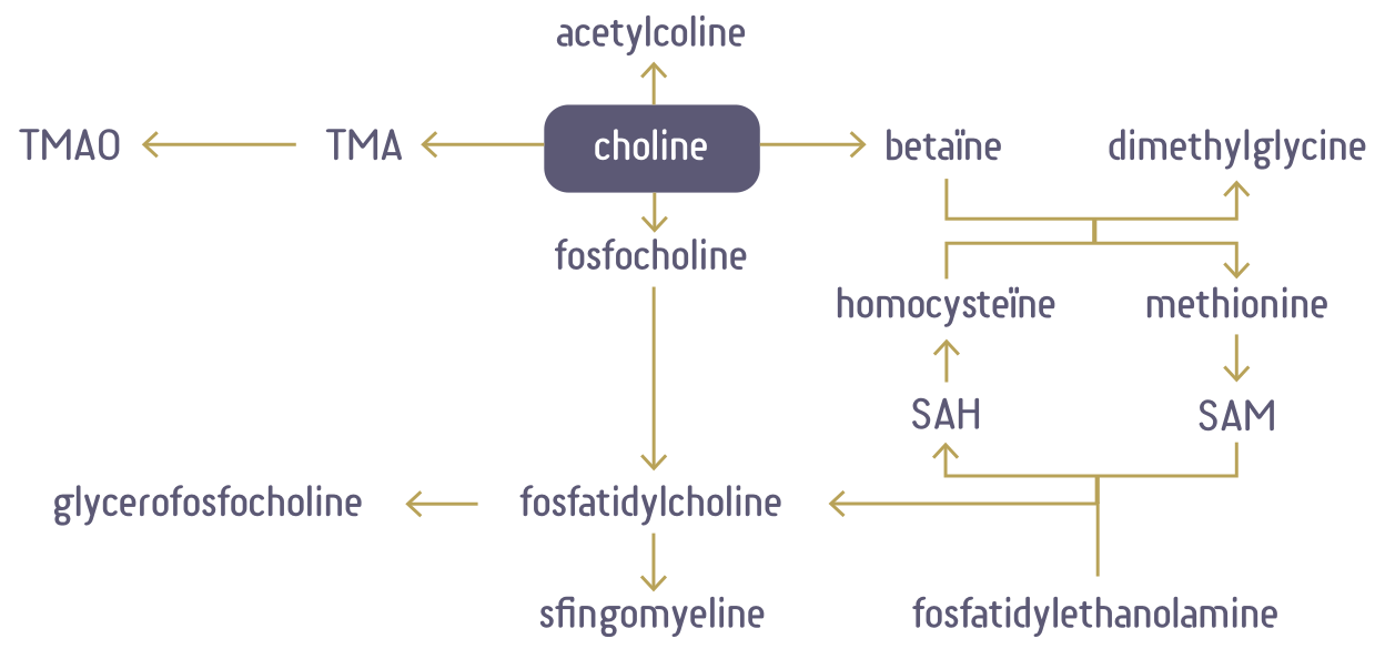 Lever en nieren kunnen choline oxideren tot betaïne, dat fungeert als een donor van methylgroepen. Dit proces helpt bij de omzetting van homocysteïne naar methionine, een belangrijke bouwsteen voor de universele methylgever S-adenosylmethionine (SAMe). SAMe is essentieel voor methylatiereacties, zoals epigenetische regulatie en de synthese van fosfolipiden.