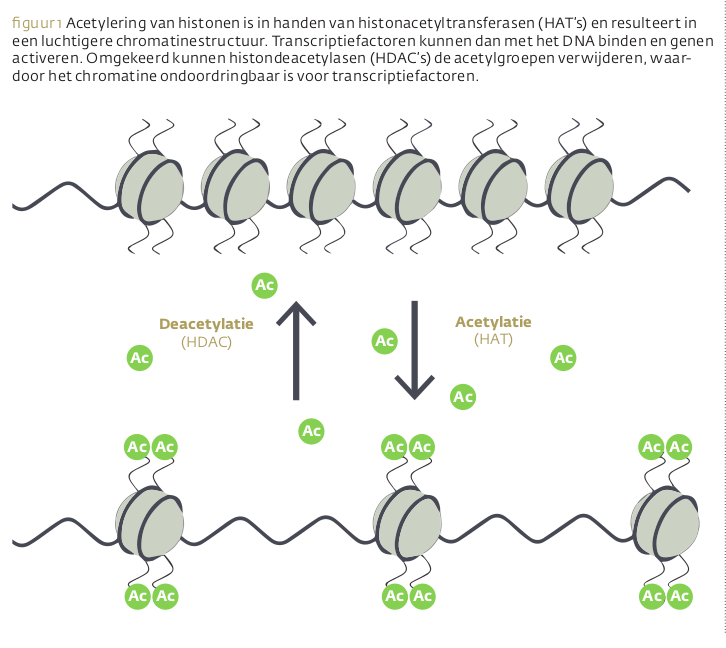 DNA is een enorm lang molecule dat compact gemaakt moet worden door een bijzondere groep van DNA-eiwitten: de histonen. DNA en histonen vormen samen het ‘chromatine’. Histonen regelen mee welke genen geactiveerd kunnen worden: ze vormen als het ware de histoncode. In tegenstelling tot de